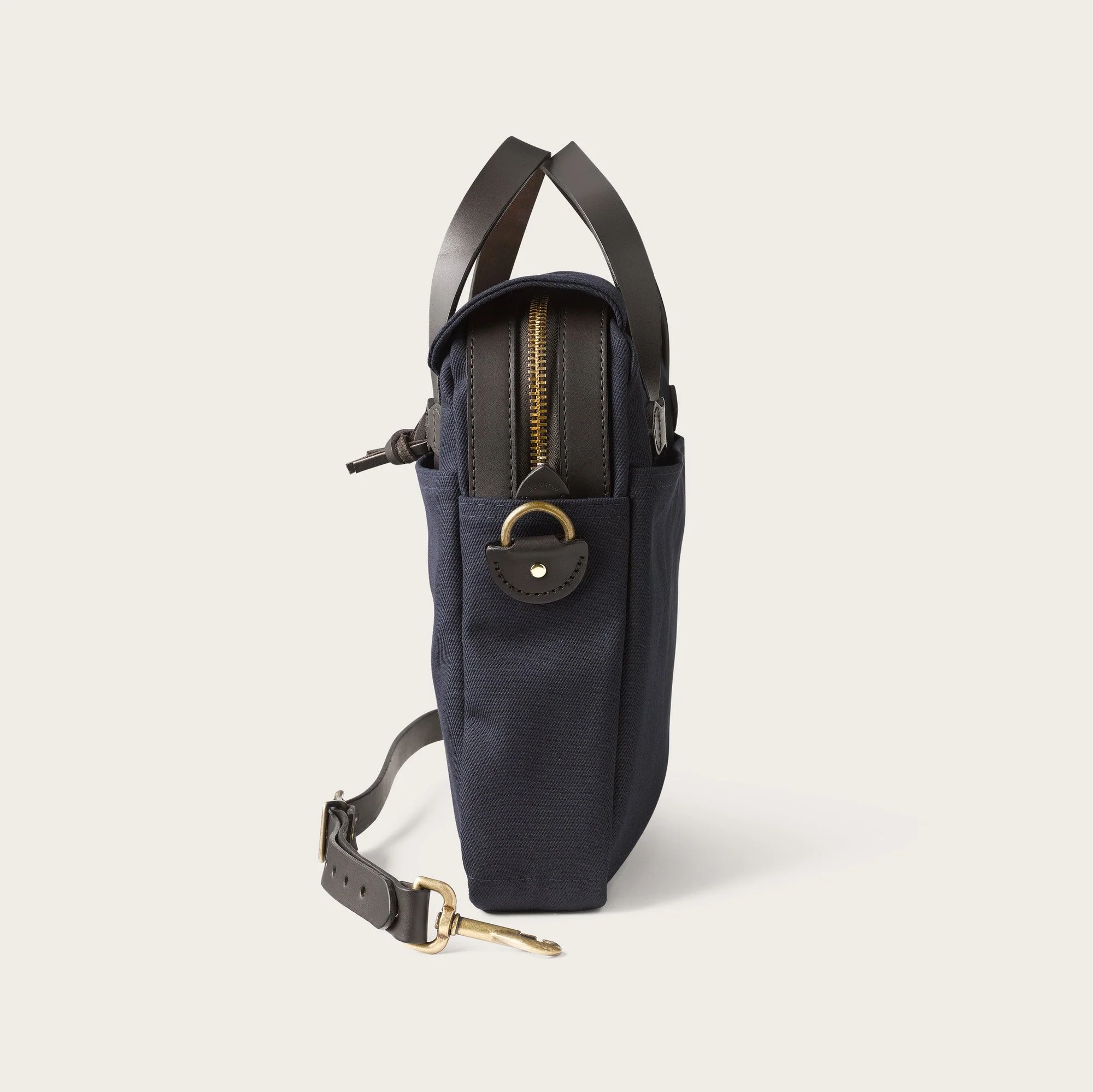 Because it’s manufactured with the sturdiest materials and construction, we’ve had customers report logging over a million air-travel miles with their Original Briefcases. Our industrial-strength Rugged Twill is a 2-ply by 3-ply twill with exceptional resistance to abrasion and wear. It’s lightly waxed, so your valuables stay dry. The leather handles and straps are cut, burnished and edge-dyed from premium Italian cow leather hides vegetable-tanned. Each hide is slowly steeped in a special bark-tannin solution, with tallows and waxes “hot-stuffed” into it during the final stages. This eco-friendly tanning process transforms cowhide into durable, pliable leather suitable for horse tack, saddlery, as well as Filson briefcases. The heavy-gauge brass zipper is rustproof, virtually indestructible, and reinforced with premium Italian cow leather. All of this is stitched together with heavy-duty, cotton-wrapped polyester thread, to ensure a briefcase that will provide decades of unfailing durability.