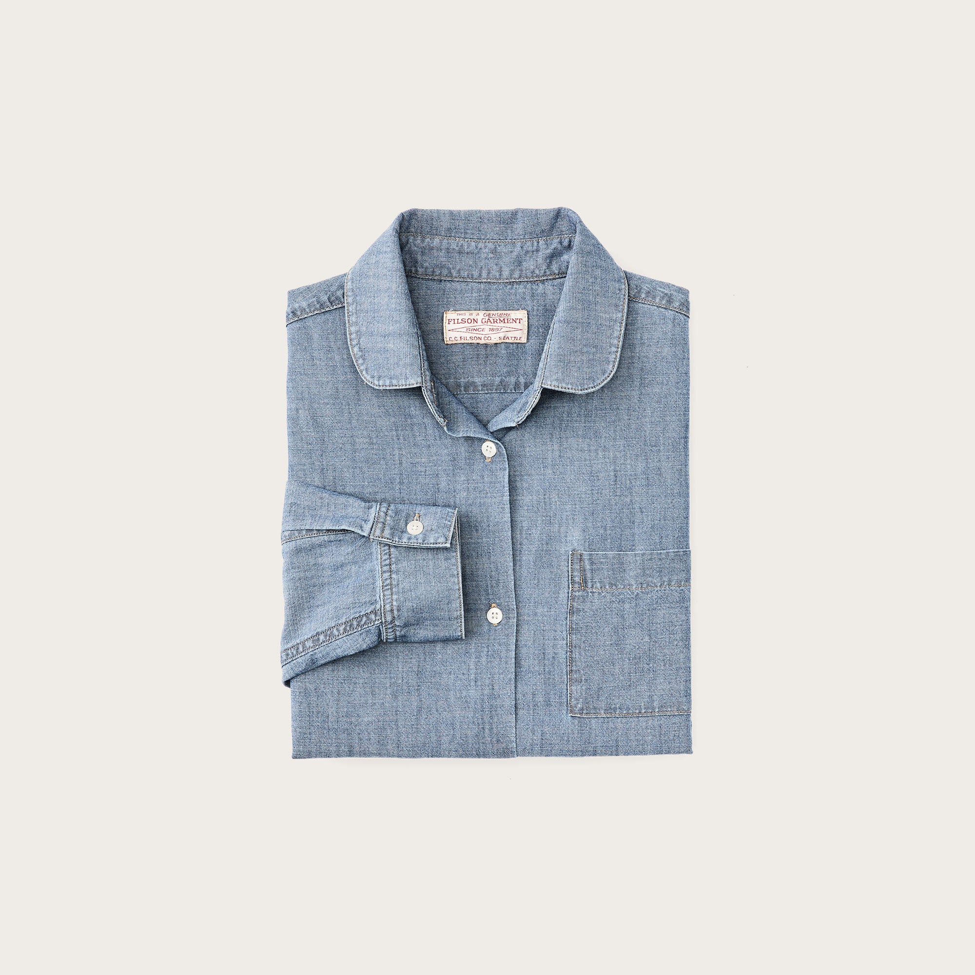 A comfortable cotton shirt made from lightweight chambray with durability rooted in its workwear traditions. Originating in France, chambray fabric shares similarities with denim, in that it’s woven from white and dyed yarns. It differs in weave, however, being a plainweave as opposed to denim’s twill weave. The curved collar provides a relaxed, casual feel. Straight hem for untucked wear. Single open chest pocket.